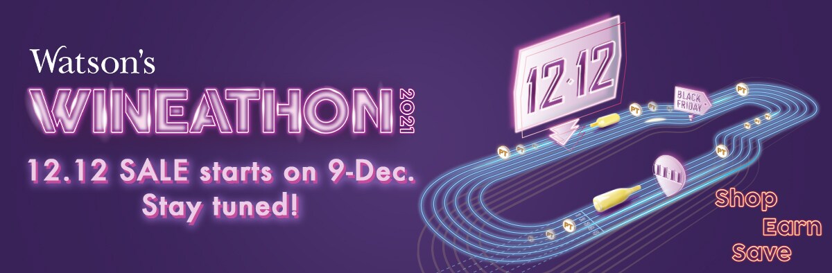 4. Customer who have purchased during 11.11 (9/11/2021 to 15/11/2021) or Black Friday SALE (25/11/2021 to 27/11/2021) period in 2021 Watson's Wineathon, is entitled to extra 5% off when buying 3 bottles of still wine or Sake in a single purchase during the promotion period of 12.12 SALE (9-13 Dec 2021); Customer who have purchased during 11.11 (9/11/2021 to 15/11/2021) and Black Friday SALE (25/11/2021 to 27/11/2021) period in 2021 Watson's Wineathon, is entitled to extra 8% off when buying 3 bottles of still wine or Sake in a single purchase during the promotion period of 12.12 SALE (9-13 Dec 2021). To enjoy the offer, the eligible customer is required to login to the corresponding eShopping account online and the discount will be automatically applied at checkout page, or present the in-app eCoupon before settling payment at the store. Each customer is limited to use the offer once, either at eStore or Store. These offers cannot be exchanged for cash and are not transferable. ^These offers do not apply to purchases of Festive Surprises items, Champagne & Spirits, redemption items, and may not be used in conjunction with other promotional offers. In case of any disputes, the decision of Watson’s Wine shall be final.
