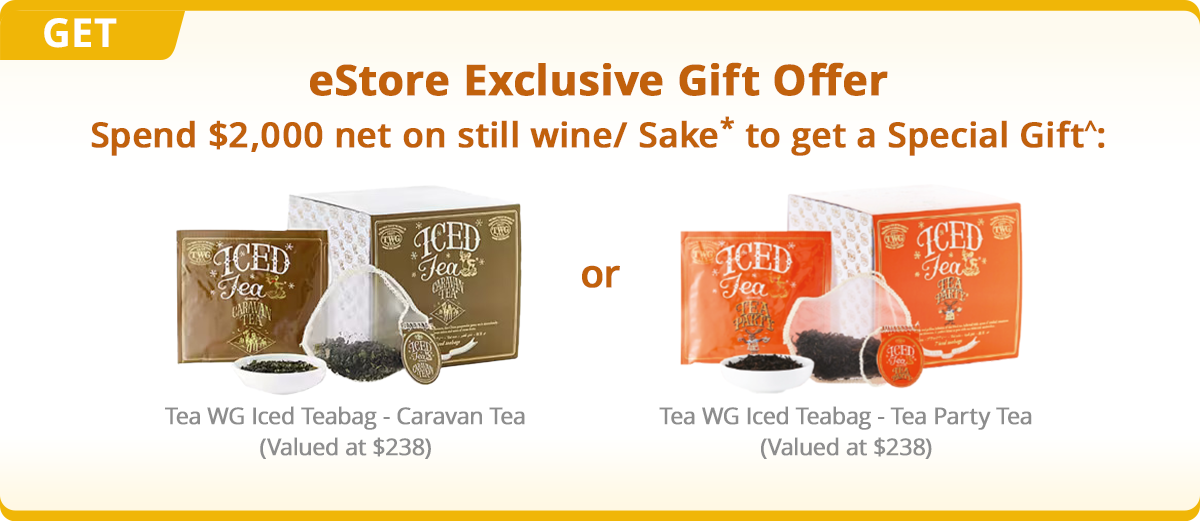 4. eStore Exclusive Gift Offer only valid at www.watsonswine.com until 13/12/2023, while stocks last. 12.12 SALE (7-13 Dec 2023). Customer is entitled to a FREE Tea WG Iced Tea Bag - Tea Party Tea or Caravan Tea (valued at $238) when spending $2,000 net on still wine/Sake in a single purchase. Splitting of transaction is not allowed. Gifts are available on a first-come, first-served basis, while stocks last. This offer does not apply to purchases of limited time offer items, Countdown Surprises items, Champagne & Spirits, redemption items and clearance sale items, and may not be used in conjunction with New Joiner Offer, Member Birthday offers and other promotional offers.