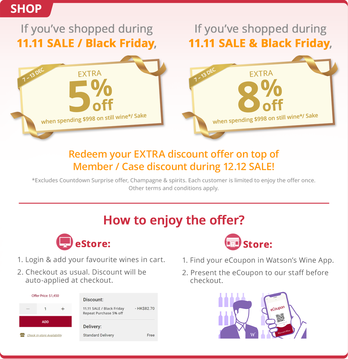 2. Repeat Purchase 5% OFF Offer during 12.12 SALE: Customer who has purchased during 11.11 SALE period (7 - 13 Nov 2023) OR Black Friday period (23 - 27 Nov 2023) in 2023 Watson's Wineathon, is entitled to extra 5% off upon spending $998 net on still wine or Sake in a single purchase during the 12.12 SALE period (7-13 Dec2023). To enjoy the offer, the eligible customer is required to login to the corresponding eShopping account online and the discount will be automatically applied at checkout page, or present the in-app eCoupon before settling payment at the store. Each customer is limited to use the offer once, either at eStore or Store. This offer does not apply to purchases of limited time offer items, Countdown Surprises items, Champagne & Spirits, redemption items and clearance sale items, and may not be used in conjunction with App Download offer, New Joiner Offer, Member Birthday offers and other promotional offers.