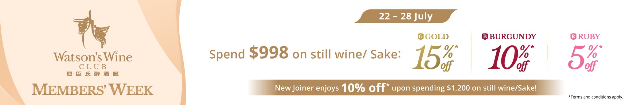 15. Super Wednesday 优惠: 优惠只适用於网店及至 2026 年 01 月 14 日为止。货品数量有限,售完即止。顾客於网店 / App 结帐时输入【优惠码 : SUPERWED 】,即享红丶白酒或清酒 95 折 。此优惠不适用於香槟及烈酒丶会员价货品丶酒鬼价货品及不可与其他优惠 (例如 Mix & Match 优惠) 同时使用。