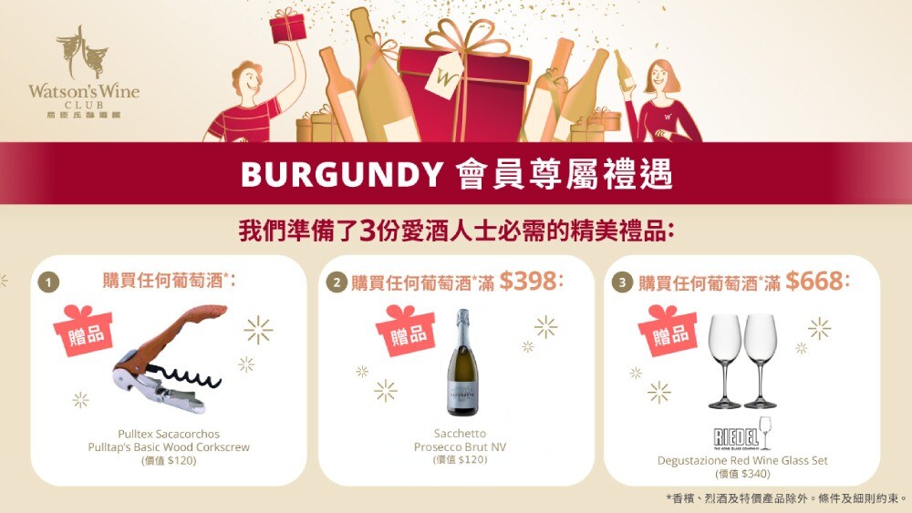 优惠有效期为30日,货品及赠品数量有限,售完或送完即止。Burgundy会员可享以下迎新优惠﹕1.下次于门市或网店购买葡萄酒,可免费获赠Pulltex Sacacorchos Pulltap’s Basic Wood 开瓶器 1个,每人最多可获1个;2. 于单次交易中购买红、白酒*及清酒满$398,可获赠Sacchetto Prosecco Brut NV 75cl 1瓶,每人最多可获1瓶;3. 于单次交易中购买红、白酒*及清酒满$668,可获赠Riedel Degustazione 红酒杯套装1套(共2隻),每人最多可获1套。*以上优惠不适用于香槟、烈酒及特价产品。Burgundy会员必须于门市付款前出示电子优惠券,方有享以上优惠;或以有关帐户登入 www.watsonswine.com,结帐时拣选电子优惠券。以上优惠只供合资格会员享用及不可转让。以上优惠只可使用一次并只适用于同一交易。以上优惠不可兑换现金或其他产品。以上优惠不可与会员生日优惠、限时优惠货品及其他优惠同时使用。屈臣氏酒窖保留更改礼品之权利而毋须事先通知。如有争议,屈臣氏酒窖保留最终决定权。图片只供参考。