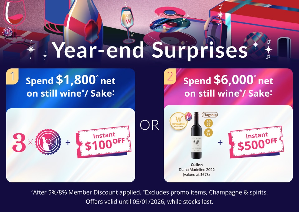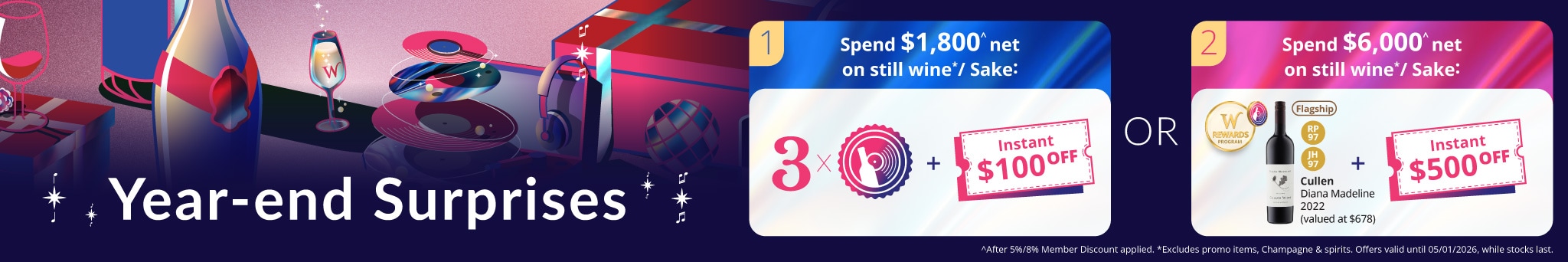 除個別活動外,活動優惠期至 2026 年 01月05日,貨品及贈品數量有限,售完或送完即止。除特別註明外,貨品容量為 75cl 。所有價錢以港幣計算。圖片只供參考。優惠不適用於限時優惠貨品、換購優惠貨品及醇酒特賣專區貨品,及不可與其他優惠同時使用。如有任何爭議,屈臣氏酒窖保留最終決定權。