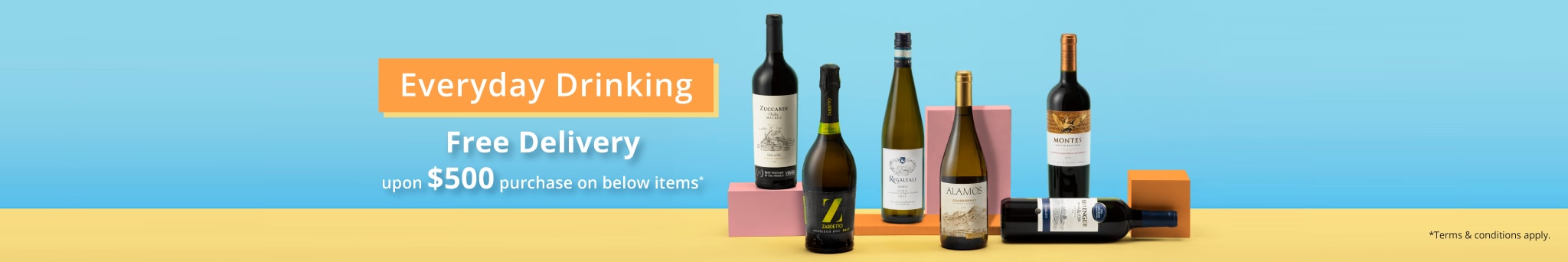 4. 「每日小酌」系列滿 $500 免運費優惠: 顧客於單次交易中購買指定全新「每日小酌」系列葡萄酒凈額滿 $500,即享免費送貨服務一次。此優惠不適用於香檳及烈酒、限時優惠貨品、十一月限時閃購貨品、換購優惠貨品及醇酒特賣專區貨品,亦不可與 Countdown Surprises 優惠、$50 即減優惠及其他優惠同時使用。享有此優惠的訂單,如有任何送貨時間的更改,恕不另行通知。每張訂單只限送一個香港境內地址,並受條款及細則約束。如需進一步了解有關送貨服務條款,請點擊 此處