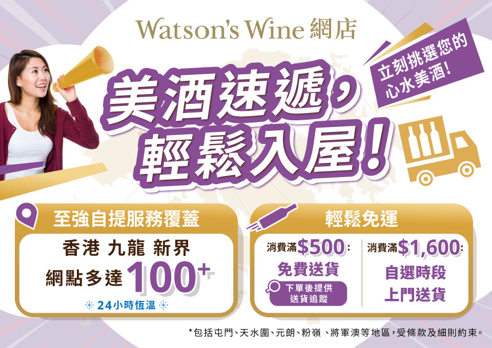 3. 「每日小酌」系列滿 $500 免運費優惠: 顧客於單次交易中購買指定全新「每日小酌」系列葡萄酒凈額滿 $500,即享免費送貨服務一次。此優惠不適用於香檳及烈酒、限時優惠貨品、酒鬼價貨品、換購優惠貨品及醇酒特賣專區貨品,亦不可與其他優惠同時使用。享有此優惠的訂單,如有任何送貨時間的更改,恕不另行通知。每張訂單只限送一個香港境內地址,並受條款及細則約束。如需進一步了解有關送貨服務條款,請點擊 此處