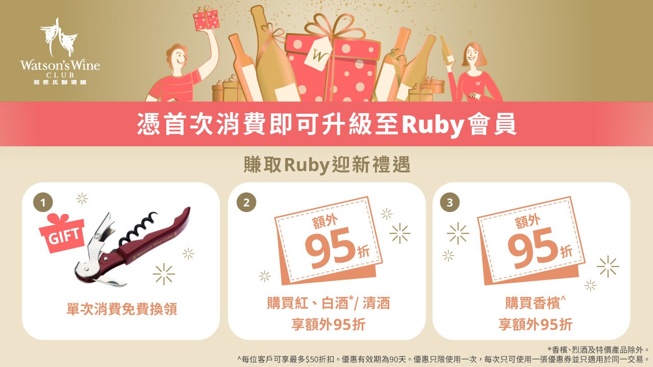 優惠有效期為90日,貨品及贈品數量有限,售完或送完即止。Ruby會員可享以下迎新優惠﹕1. 於單次交易中購買紅、白酒*或清酒,可享額外95折,該95折只適用於該交易之紅、白酒*及清酒。*香檳、烈酒及特價產品除外。 2. 於單次交易中購買香檳,可享額外95折,該95折只適用於該交易之香檳。每位客戶可享最多$50折扣。 Ruby會員享有2張電子優惠券及必須於門市付款前出示電子優惠券,方有享以上優惠;或以有關帳戶登入 www.watsonswine.com,結帳時揀選電子優惠券。以上優惠只供合資格會員享用及不可轉讓。優惠只限使用一次,每次只可使用一張優惠券並只適用於同一交易。以上優惠不可兌換現金或其他產品。以上優惠不可與Burgundy會員迎新優惠、會員生日優惠、限時優惠貨品及其他優惠同時使用。如有爭議,屈臣氏酒窖保留最終決定權。